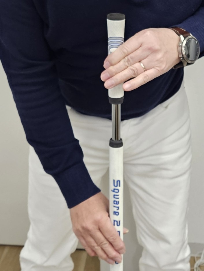 もう一つの打ち方は、左脇を閉めてアドレスし、左手の動きを最小限にし、肩を動かさずに右手だけを動かしてグリップエンドを支点としてパッティングする方法です。この打ち方は、私が長尺を買ってからやっていた打ち方です。