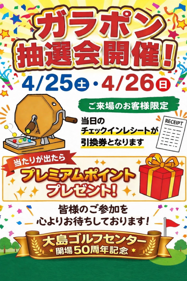 大島ゴルフセンター会場50周年記念ガラポン抽選会を開催いたします✨